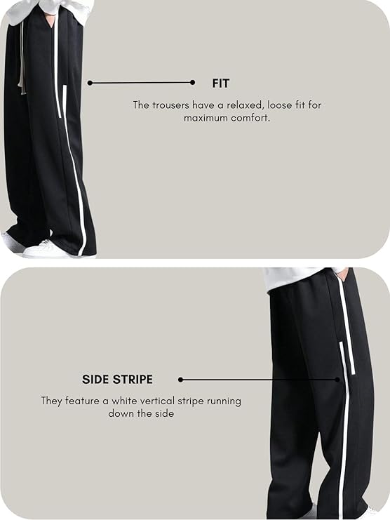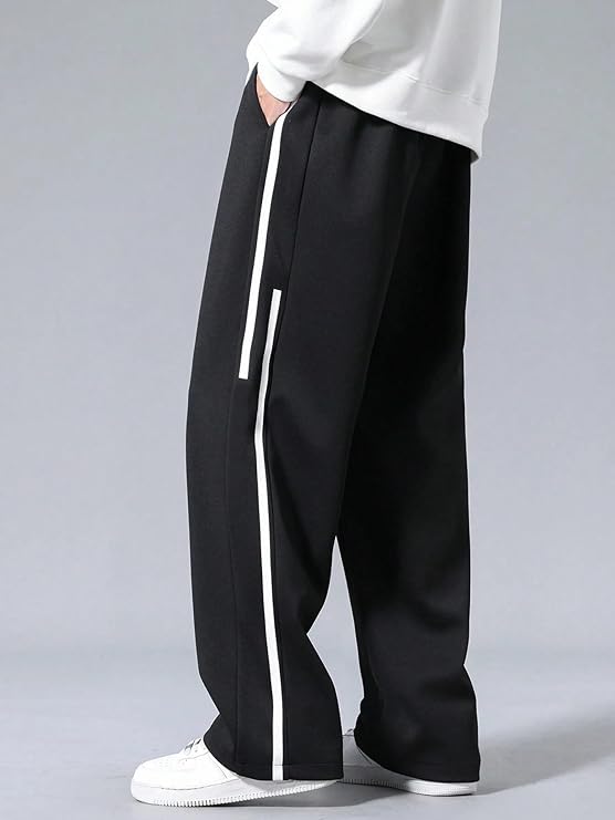 These black pants feature a sleek white stripe down the side, adding a touch of modern style to any casual outfit.
